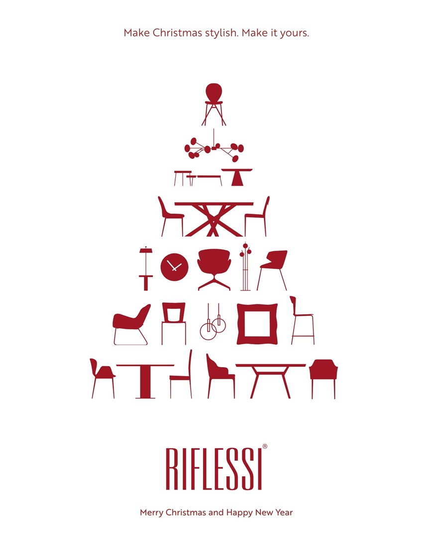 RIFLESSIから、家具コレクションのイラストが可愛いシーズンズ・グリーティングスが届きました♪ ブランドのアイテムをスタイリッシュに表現したピクトグラムでクリスマスツリーがデザインされています。