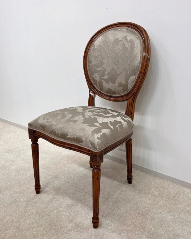 クリーム系のダマスク柄ファブリックが優美な、ルイ15世スタイルのダイニングチェアも新たに入荷いたしました。Bassanoカラーのフレームにシルバー箔をあしらい、華やかさの中にも落ち着きと気品を感じらせる仕上がりです。