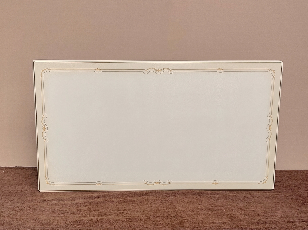 アンティーク感のあるアイボリーホワイトを基調に、クラック(ひび割れ加工)を入れ、アクセントにゴールド(金箔)のラインを施して贅沢に仕上げました。天板に熟練のマスターペインターによる手描きの飾り模様とグラデーションを入れることで、ニュアンスのある繊細で美しい仕上がりになりました。