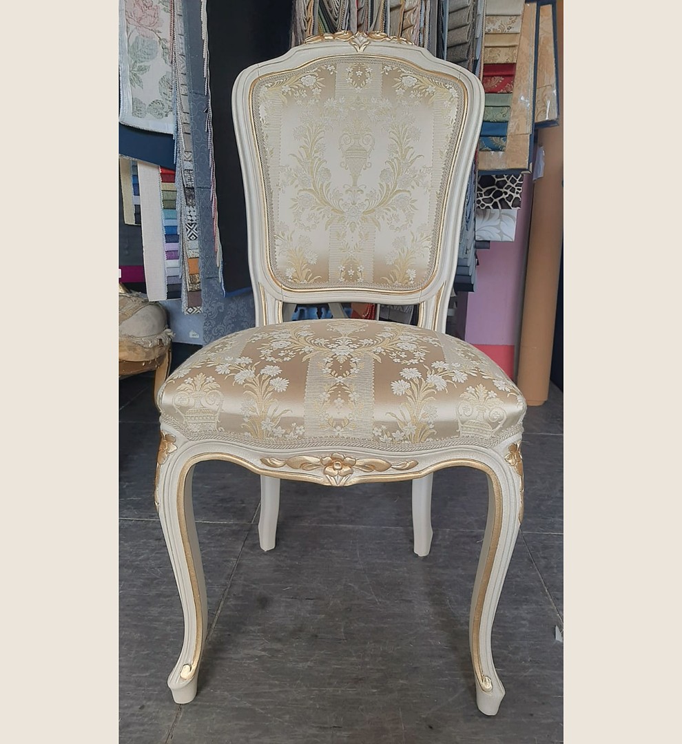クリームとゴールドの高級感のあるファブリックで張られたダイニングチェア。テーブルと同じ彫刻の入っているので統一感のある仕上がりに。