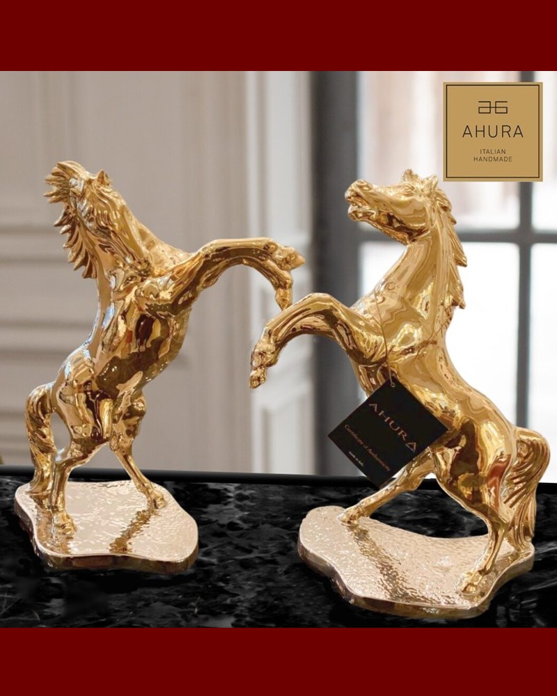 イタリアのブランドAHURAによるこの芸術的な馬のオブジェは、熟練の職人が一つひとつ手仕事で仕上げた逸品。躍動感あふれる立ち姿が印象的です。ボディには重厚感ある24K鍍金、台座部分はプラチナ鍍金が施されています。ハンマーで打ち出したような台座の槌目模様が陰影を生み出し、華やかな中に落ち着きと品格を添えています。左右の馬は、表情やボディライン、台座のデザインがそれぞれ異なるため、ペアで飾ると一層存在感が引き立ちます。